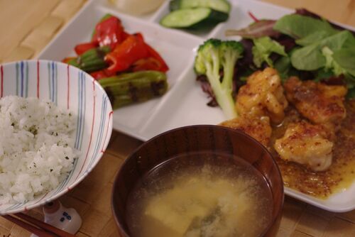 朝…クロワッサン 昼…新米、納豆、塩鮭、ぬけづけのきゅうり、わかめと豆腐の味噌汁、ぶどう 夜…わかめごはん、ハニーマスタードチキン、パプリカとししとう焼びたし、梨、わかめと豆腐の味噌汁 夜…スイカウォッカ 冷凍庫の底から2月に作った塩鮭が出てきたし…